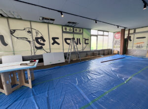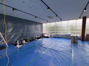 まずは、皆様からいただいた大切なお花や、心を込めて作り上げた受付周りなどを傷つけることがないよう、丁寧に養生シートで保護する作業からスタートしました。