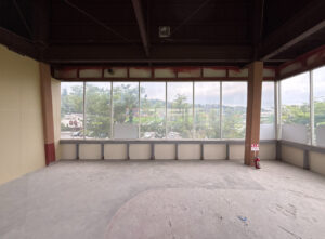 見てください、この広々とした空間! 大きな窓の外には、ソフィアモールで楽しまれているお客様の様子が見えます。 今はまだ何もないコンクリート打ちっぱなしの状態です。