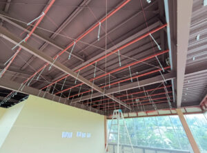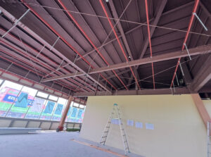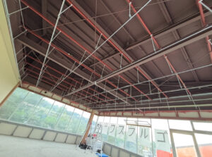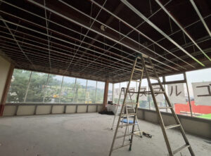 何もない、がらんとした空間に、天井の土台となる骨組みを一人で組み上げていきます。 高い天井を見上げながらの作業は正直、なかなか大変です(笑)。 ですが、この金属の骨組みが、これから皆さんのゴルフライフを照らす照明や、快適な空間を作る空調を支える重要な土台になるんだと思うと、自然と力が入ります。