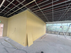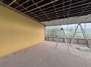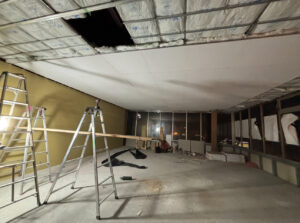 この写真に写っているフワフワしたものが断熱材。これを天井裏に隙間なく敷き詰めることで、夏の厳しい暑さや冬の寒さを和らげ、一年を通して快適な練習環境を作ります。 そして、天井にぽっかり空いた四角い穴は、後日作業に来てくれるエアコン屋さんのための開口部です。こういう「段取り」が、後々の作業をスムーズにするんです。