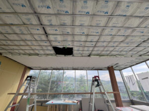 天井の工事は、まず天井裏の骨組みに「断熱材」を置き、そのすぐ下に天井材である「ジプトーン」を貼っていく、という作業の地道な繰り返しです。