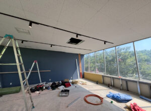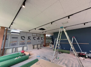 ついに、天井に照明(ライティングレール)と、点検口が付きました! スイッチを入れて、明かりが灯った瞬間…ただの「工事現場」から、一気に「スクールの空間」へと空気が変わった気がして、一人で静かに感動してしまいました。