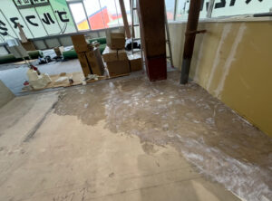 まずは、スクール全体の通路となる部分から着手しました。 床に専用の接着剤を丁寧に塗り広げていきます。