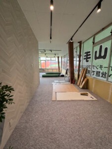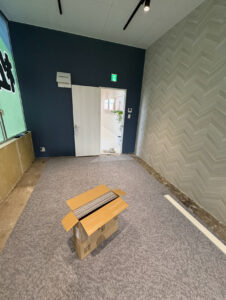 そして、シックなグレーのタイルカーペットを、一枚一枚、丁寧に、そして正確に敷き詰めていきます。この作業、意外と根気がいるんです。