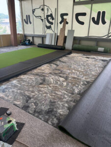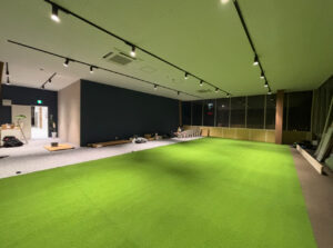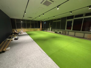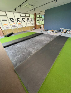通路部分が完成したら、いよいよゴルフの打席部分の施工です! 鮮やかな緑色の人工芝を、床一面に広げていきます。この瞬間が、一番ワクワクしました!